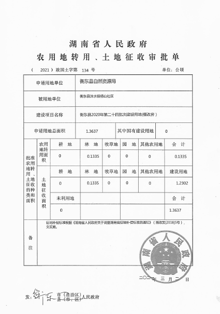 衡東縣2020年第二十四批次建設用地(2021)政國土字第134號