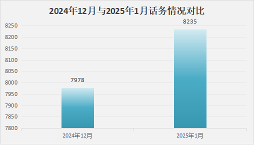 (一)話務(wù)渠道受理情況。2025年1月份,12345熱線話務(wù)總數(shù)為8235個,日均266個,形成有效工單4455件, 轉(zhuǎn)派各成員單位1720件,在線辦結(jié)數(shù)2735件,綜合辦結(jié)數(shù)為4401件,綜合辦結(jié)率達98.79%,回訪滿意率83.85%。環(huán)比2024年12月份電話總數(shù)增加3.22%。