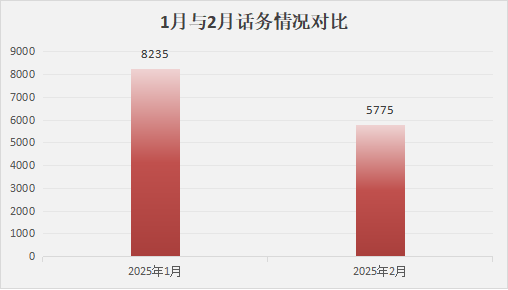 根據縣12345政務服務熱線中心(以下簡稱"12345 熱線")系統平臺歸集的數據統計,2025年2月,12345熱線話務總數為5775個,非話務受理渠道(含省長信箱、書記市長信箱、國家政務服務平臺、中國政府網、書記縣長信箱、政協云、湘易辦、省級12345熱線等)受理各類訴求83件,辦結70件。