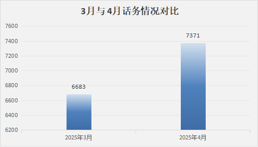根據(jù)縣12345政務(wù)服務(wù)熱線中心(以下簡(jiǎn)稱"12345 熱線")系統(tǒng)平臺(tái)歸集的數(shù)據(jù)統(tǒng)計(jì),2025年4月,12345熱線話務(wù)總數(shù)為7371個(gè),非話務(wù)受理渠道(含省長(zhǎng)信箱、書記市長(zhǎng)信箱、國(guó)家政務(wù)服務(wù)平臺(tái)、中國(guó)政府網(wǎng)、書記縣長(zhǎng)信箱、政協(xié)云、湘易辦、省級(jí)12345熱線等)受理各類訴求92件,辦結(jié)53件。