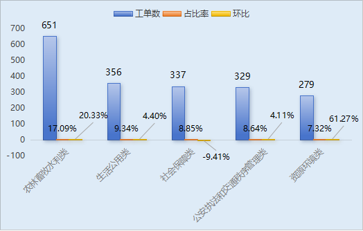 (三)訴求內(nèi)容分析。4月,群眾來(lái)電訴求主要集中在:農(nóng)林畜牧水利類651件,占訴求量的17.09%;生活公用類356件,占訴求量的9.34%;社會(huì)保障類337件,占訴求量的8.85%;公安執(zhí)法和交通秩序管理類329件,占訴求量的8.64%;資源環(huán)境類279件,占訴求量的7.32%。與上月數(shù)據(jù)相比,本月農(nóng)林畜牧水利類環(huán)比增長(zhǎng)20.33%,生活公用類環(huán)比增長(zhǎng)4.40%,公安執(zhí)法和交通秩序管理類環(huán)比增長(zhǎng)4.11%,資源環(huán)境類環(huán)比增長(zhǎng)61.27%,社會(huì)保障類環(huán)比減少9.41%。