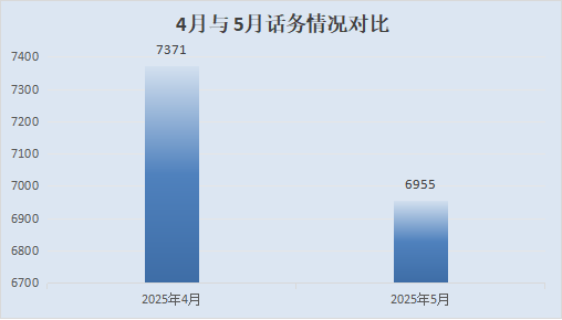 2025年5月,12345熱線話務總數為6955個,非話務受理渠道(含省長信箱、書記市長信箱、國家政務服務平臺、中國政府網、書記縣長信箱、政協云、湘易辦、省級12345熱線等)受理各類訴求86件,辦結53件。