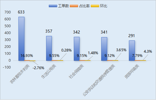 訴求內容分析。群眾來電訴求主要集中在:農林畜牧水利類633件,占訴求量的16.93%;生活公用類357件,占訴求量的9.55%;社會保障類342件,占訴求量的9.15%;公安執法和交通秩序管理類341件,占訴求量的9.12%;資源環境類291件,占訴求量的7.79%。與上月數據相比,本月生活公用類環比增長0.28%,社會保障類環比增長1.48%,公安執法和交通秩序管理類環比增長3.65%,資源環境類環比增長4.3%,農林畜牧水利類環比減少2.76%。