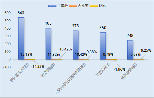 (三)訴求內(nèi)容分析。群眾來電訴求主要集中在:農(nóng)林畜牧水利類543件,占訴求量的15.18%;社會保障類405件,占訴求量的11.32%;公安執(zhí)法和交通秩序管理類373件,占訴求量的10.42%;生活公用類350件,占訴求量的9.78%;金融商貿(mào)財經(jīng)類248件,占訴求量的6.93%。與上月數(shù)據(jù)相比,本月社會保障類環(huán)比增長18.42%,公安執(zhí)法和交通秩序管理類環(huán)比增長9.38%,金融商貿(mào)財經(jīng)類環(huán)比增長9.25%,生活公用類環(huán)比減少1.96%,農(nóng)林畜牧水利類環(huán)比減少14.22%。