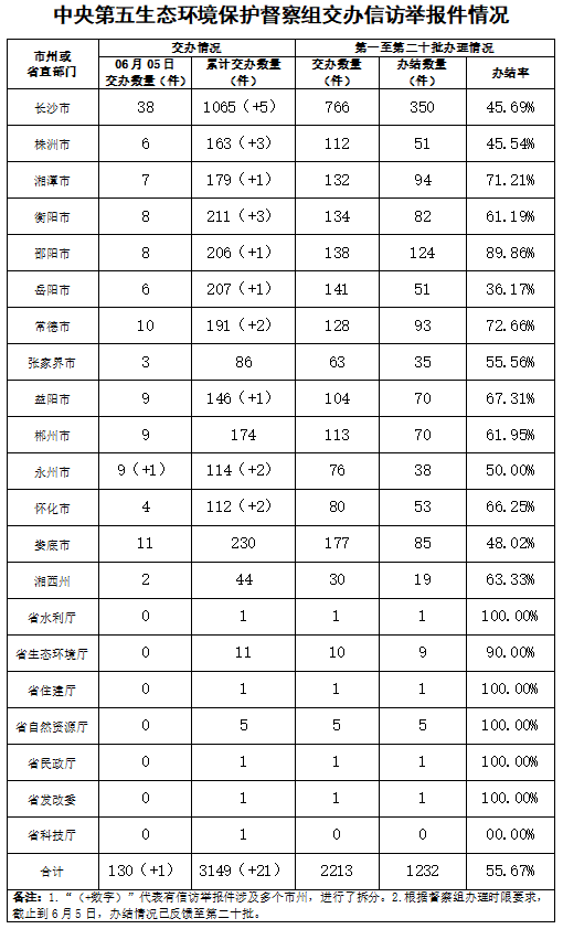 ?中央第五生態(tài)環(huán)境保護(hù)督察組今天向湖南交辦群眾信訪舉報(bào)件130件(來電舉報(bào)72件,來信舉報(bào)58件),其中重點(diǎn)件10件。我省分解后交辦131件,其中重點(diǎn)件10件。