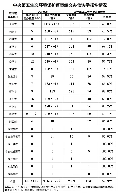 中央第五生態(tài)環(huán)境保護督察組今天向湖南交辦群眾信訪舉報件165件(來電舉報85件,來信舉報80件),其中重點件7件。我省分解后交辦166件,其中重點件7件。