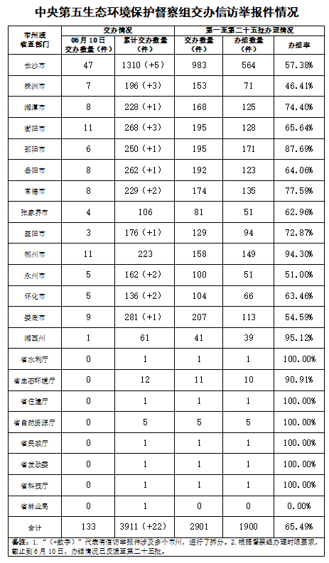 中央第五生態(tài)環(huán)境保護(hù)督察組今天向湖南交辦群眾信訪舉報(bào)件133件(來電舉報(bào)97件,來信舉報(bào)36件),其中重點(diǎn)件2件。