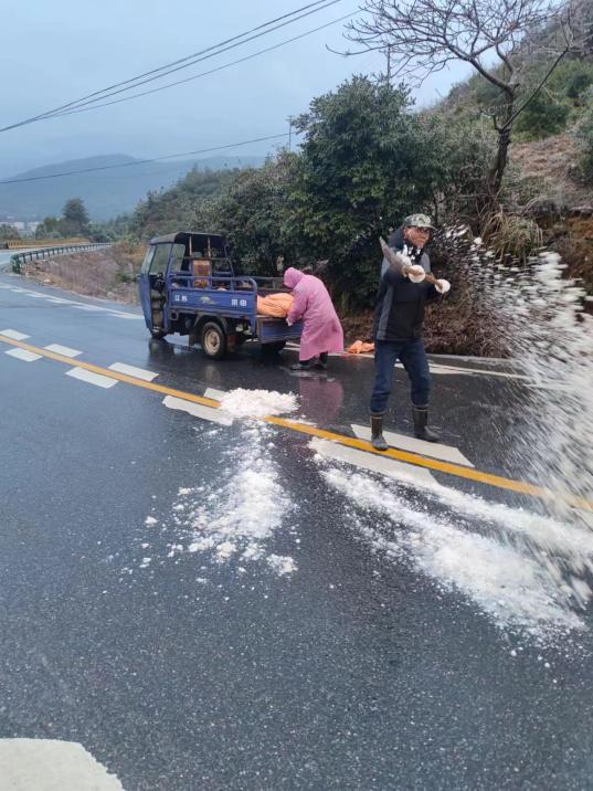 在與草市鎮交界山處,江東橋等車流量大的路段,鄉政府工作人員一方面提醒過往車輛要保持安全車距低速行駛,注意安全,避免事故發生。一方面利用鐵鍬、掃帚等工具清掃路面積雪,同時將工業鹽撒向路面,為來往車輛做好防滑措施,最大限度的減少了道路交通安全隱患。23日晚,一外來車輛由草市鎮經過南灣鄉前往安仁縣,由于道路結冰在合江村路段停滯,適時該群眾撥打12345熱線求助,當晚值班人員接到縣里轉撥電話立即前往除冰,經過兩三個小時"保駕護航",該名群眾安全駕車過鄉。